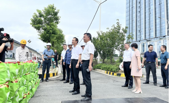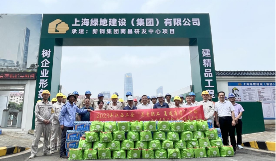 在新钢集团南昌研发中心建设项目,向东一行为酷热高温下正在作业的职工送去矿泉水、绿豆、冰糖等降温解暑物品,并提醒他们在保证人身安全的前提下,要科学统筹好工程质量与工期、劳动生产与身体健康的关系,把工程打造成品质工程、精品工程。