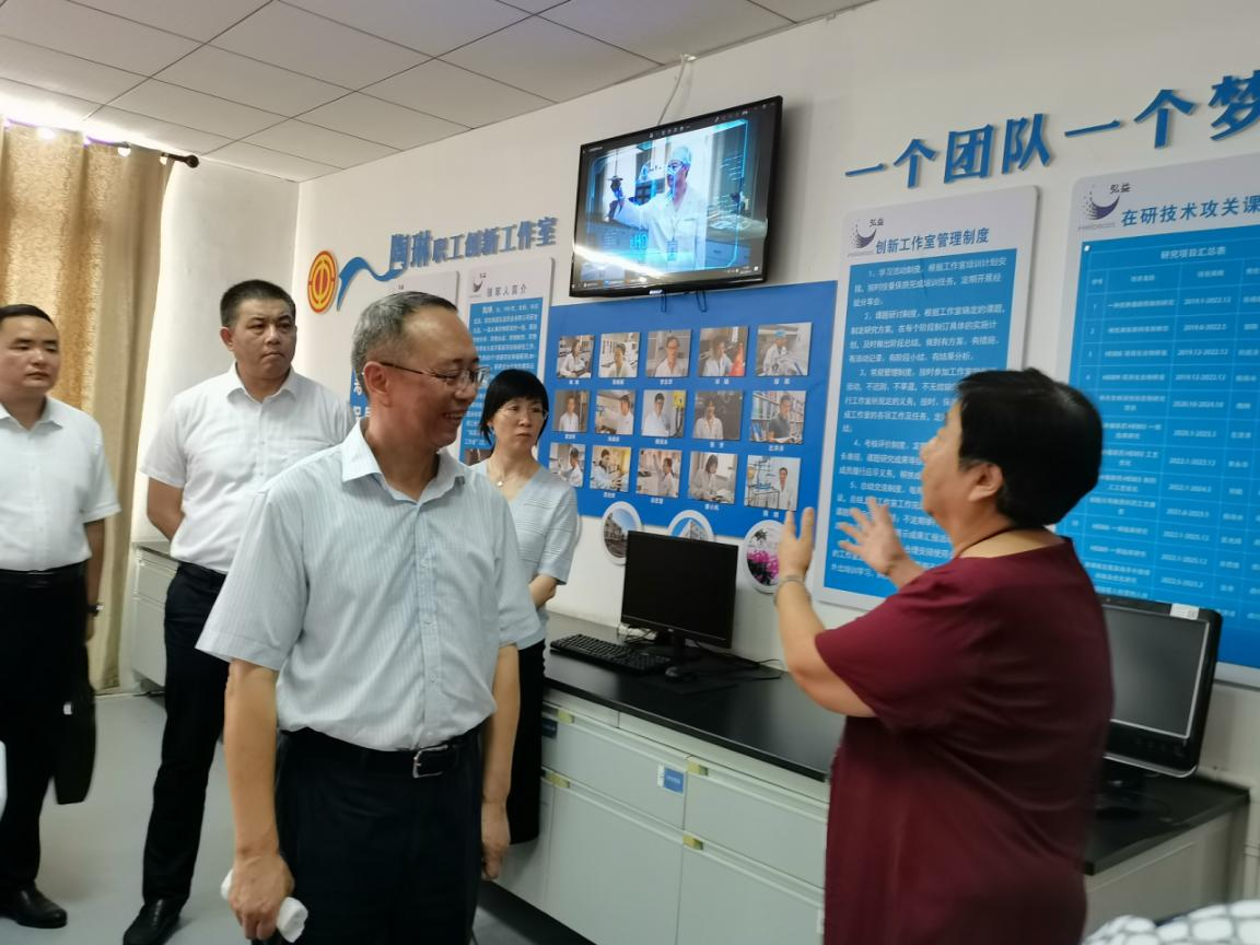 最后,刘德辉一行来到南昌弘益药业有限公司,听取了企业工会工作情况汇报,实地察看了陶琳职工创新工作室,深入了解工作室的团队建设、运营管理、课题攻关等情况,对工作室在企业创新发展中的引领作用给予充分肯定。他指出,劳模大师、能工巧匠是企业发展壮大的宝贵财富,更是社会经济高质量发展的主力军。要以职工创新工作室为平台,充分调动企业一线职工的群体活力,凝聚广大职工的智慧和力量,引领他们投身到各项科技攻关活动中,加速企业的创新发展。