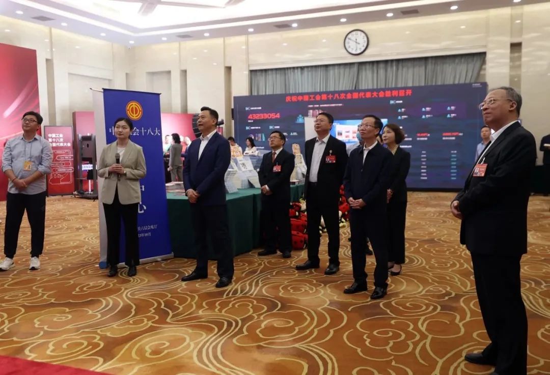 在全国工会融媒平台展示大屏和《中国工人》展示区,他驻足良久,详细了解《工人日报》、中工网、《中国工人》等媒体关于大会融媒产品生产和传播情况,叮嘱大家全力以赴宣传好中国工会十八大,充分展示新时代职工代表和工会工作者的新气象、新形象、新风采。