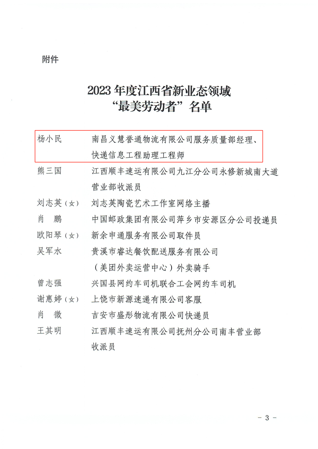 全省2023年度新业态领域“最美劳动者”名单(共10名)