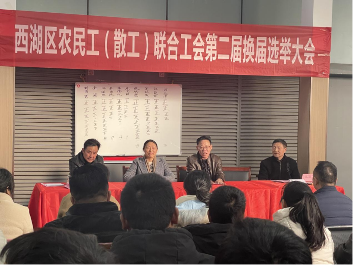 12月26日下午,西湖区农民工(散工)联合工会召开第二届换届选举大会,选举产生了西湖区农民工(散工)联合工会第二届委员7名,工会主席1名,经审委员3名,经审主任1名,女职委员3名,女职委主任1名,圆满完成了工会换届选举工作。