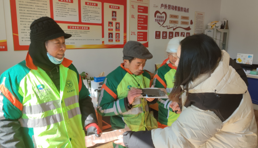 盈创·华兴产业园工会户外劳动者驿站向除雪的环卫工人们送上了围巾、手套等保暖物资。