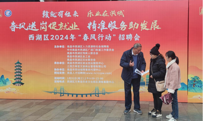 1月31日上午,由西湖区总工会、西湖区人力资源和社会保障局等部门单位举办的“春风送岗促就业 精准服务助发展—‘春风行动’招聘会”广润门专场招聘活动,在西湖区万寿宫历史文化街区游客集散中心正式启动。