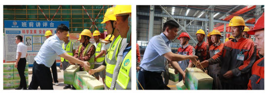 张霖一行先后来到江西桐韵速递有限公司、致邦住宅工业集团有限公司、县医科园邻里中心建设现场、舒芬街社区工会驿站,向高温酷暑天气下坚守岗位的一线职工、环卫工人和新就业形态劳动者送去了牙膏、冰糖雪梨、蜂蜜、莲子、南昌拌粉、清凉便携防暑套装等六种夏季防暑降温物品,对他们不畏高温、勤勤恳恳、坚守工作岗位的敬业精神表示敬佩,叮嘱他们在高温作业时要科学安排作息时间,合理避开高温时段,及时做好防暑降温预防措施,确保身体健康和安全工作两不误,用健康的体魄和良好的精神状态去推动县域经济高质量发展,为建设美好生活贡献力量。