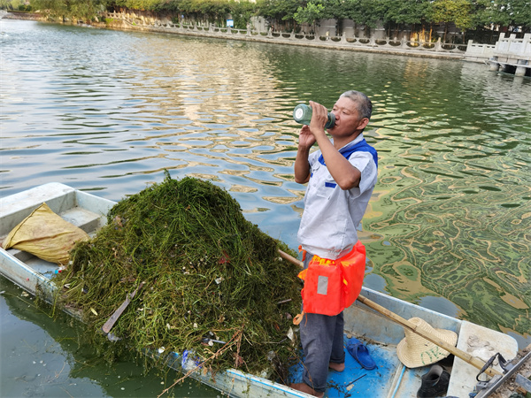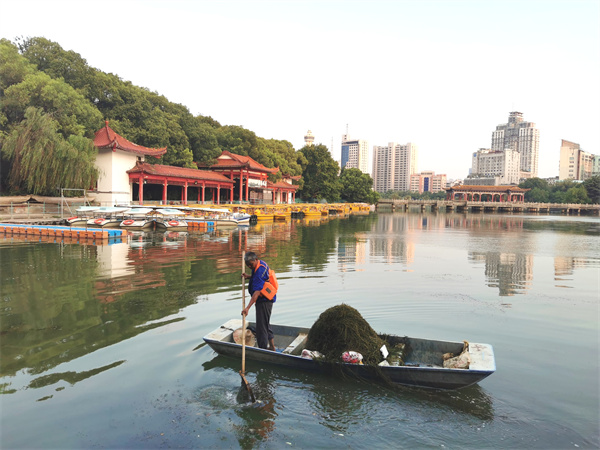 “鸣榔百花洲,系船杨柳树。”百花洲畔,一顷碧波,是吴师傅这样的水上环卫工人们用辛勤汗水换来的。向这些高温下的劳动者致敬,也倡议广大市民与他们一同守护清澈湖水,在公园湖边休闲纳凉时,请勿把包装和瓶罐扔进湖里,共同守护城市碧波。