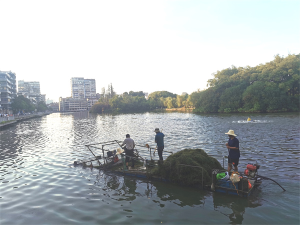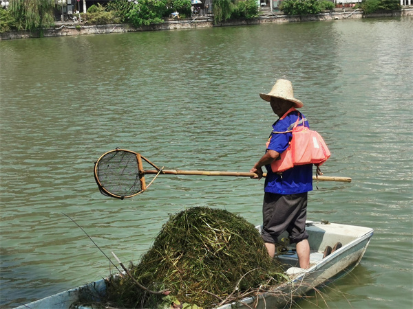 近日,气温节节攀升,而在城市湖面,总能看到一群头戴草帽、身穿橙色救生衣、手握长杆网篓,顶着烈日坚守在小船上,不辞辛劳地将湖面上的垃圾、水草清理干净,他们就是水上环卫工。