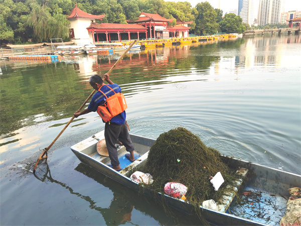 在南昌市八一公园内,只见几名湖面养护工划着小船,顶着烈日,巡游在湖面的各个角落,不停清理着漂浮在水面的垃圾和水草。还有一艘剪草船在湖中心,把冒出水面的水草处理好,防止公园内的电动船和碰碰船被水草缠绕。当时正值晌午,湖面热浪翻滚,环卫工人的衣服早已被汗水湿透,但他们没有一丝退缩,耐心细致地清理着湖面垃圾。