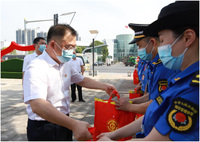 在华东建材大市场的广场,叶修堂给坚守在高温酷暑中的环卫工人、城管执法队员送去了丝丝清凉、暖暖关爱,感谢他们任劳任怨、恪尽职守,为创造优美、舒适、干净的市容环境所付出的辛勤劳动,并嘱咐他们要采取有效措施、合理安排时间、注意防暑降温,希望他们继续发扬艰苦奋斗、无私奉献精神,为建设干净整洁、安全有序的城市环境而不断努力,推动我区高质量跨越式发展再上新台阶。